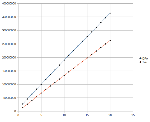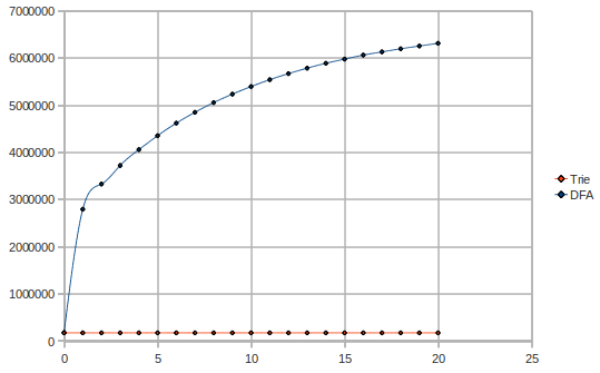 Surprise! The DFA has a rather exponential/quadratic complexity, while the trie keeps pretty linear or rather logarithmic.