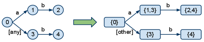 The main problems of the conversion are the size of the DFA and the complexity of the algorithms. Although not obvious, in the example above, the DFA can get significantly bigger than the NFA, when using "#" in patterns. In some cases, a "#" can cause a node to link to all other nodes in the graph. For this reason, it would be useless to try to build the whole DFA from the start, and then rebuild it entirely whenever a new binding is added.