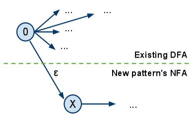 To overcome this problem we thought of a way of patching the DFA with a new pattern when a new binding is created. How? Construct the NFA for the new pattern and link it to the existing DFA like this: