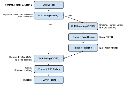 Apart from native WebSockets, SockJS comes with the support for few carefully chosen transport protocols, and all of them support cross-domain communication. The basic idea is that there should be a decent streaming and polling protocol for every browser. The polling ones must work work in environments with restrictive proxies and support old browsers. There are three ways every browser can establish connection: