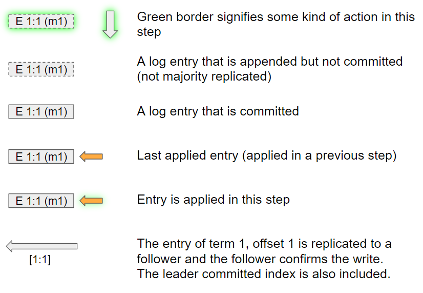 Each diagram consists of three queue replicas, one leader and two followers. We see the state of the log, the service queue, the queue representation and the “apply” actions. Each operation has the format “command term:offset data”. So for example E 1:1 m1 is the enqueue command, which is added in the first term, has the first offset and is message m1. Terms and offsets are Raft algorithm terms and not super important in order to understand local delivery (but I recommend reading up on the Raft algorithm if you find this interesting).