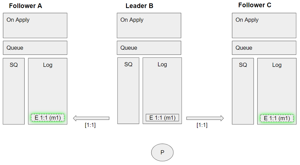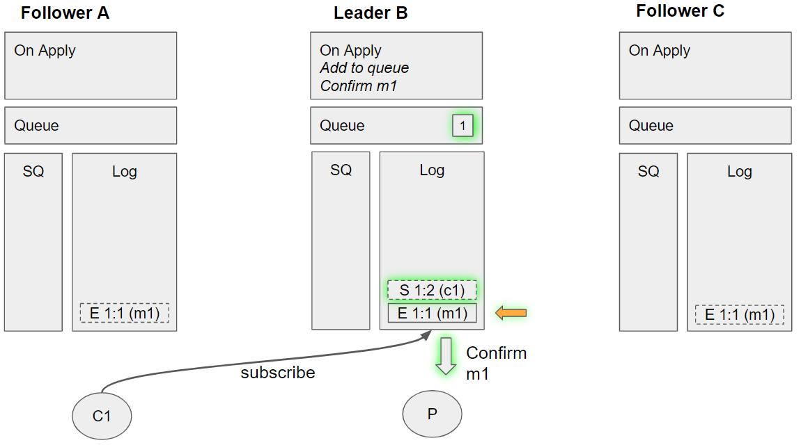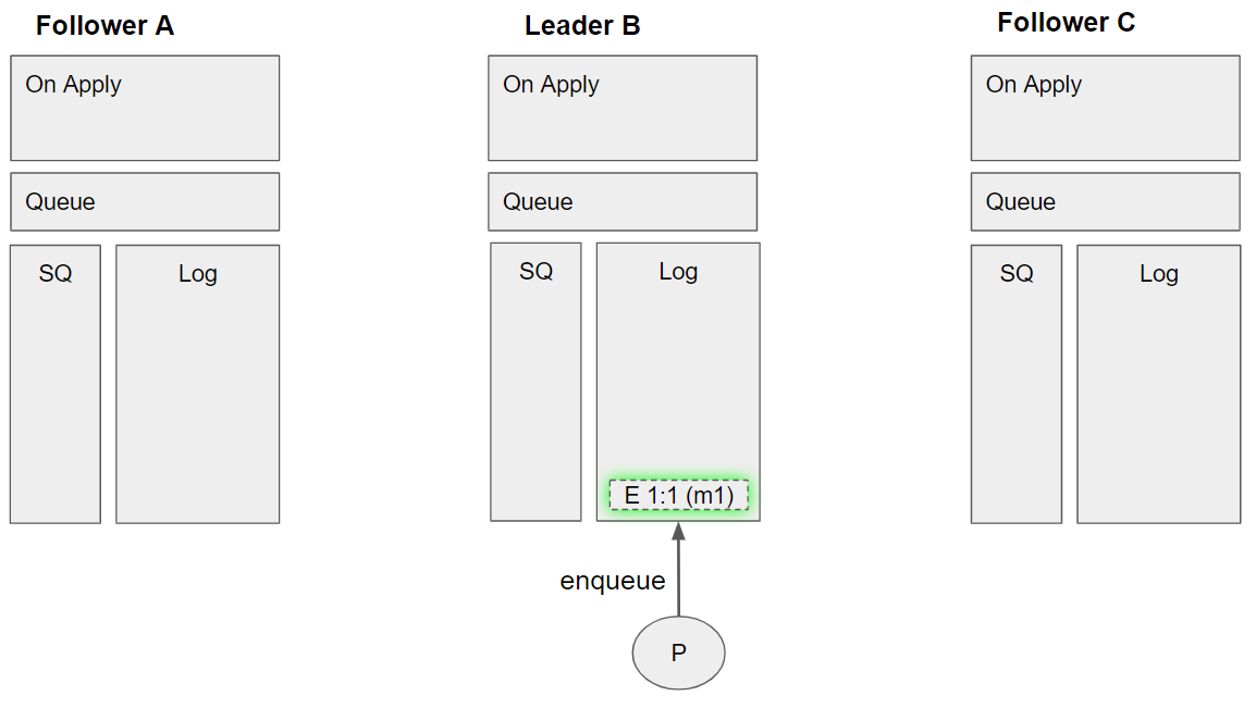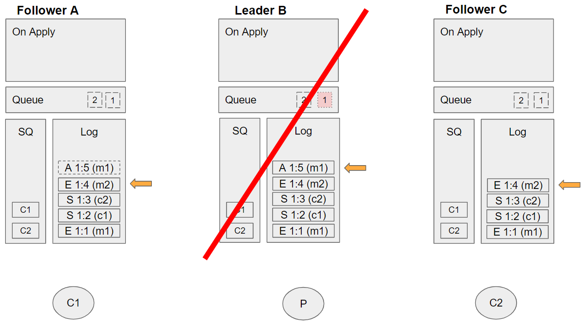 • Command enqueue m1 is applied by leader B (because it is now committed).