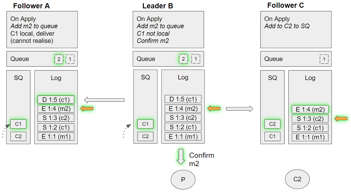 • Follower A takes the next undelivered message, m2. Dequeues C2 from its SQ, but C2 is not local. Tracks m2 as being handled by C2, requeues C2 on the SQ.